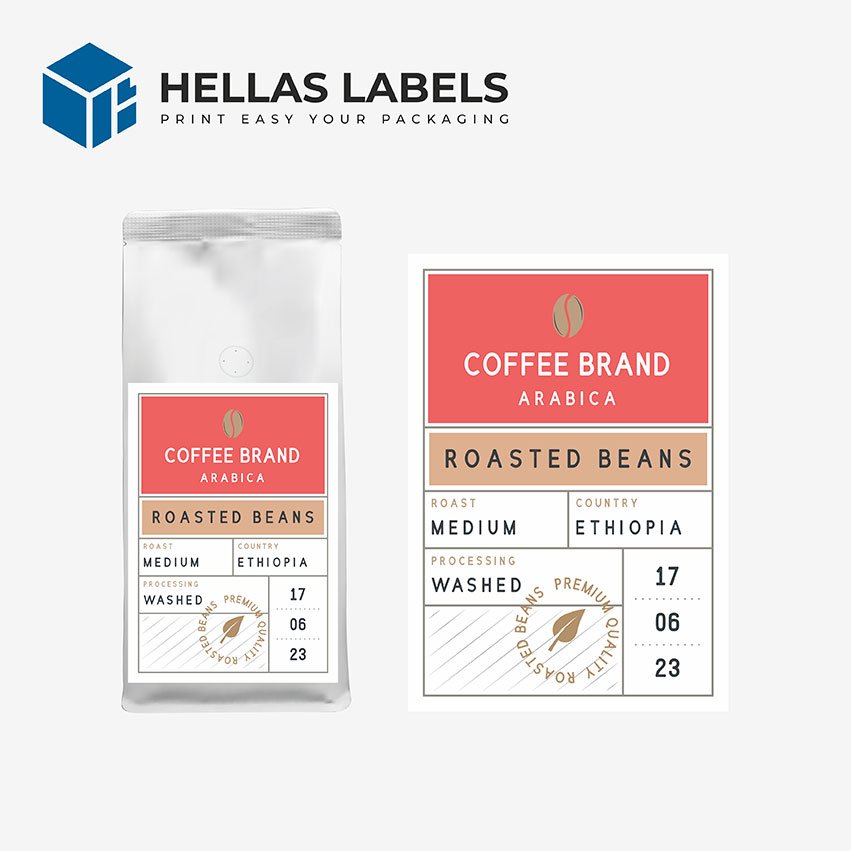Αυτοκόλλητες προσωποποιημένες ετικέτες για συσκευασία καφέ κιλού με δικό σας κείμενο η λογότυπο ακόμη και χρωματισμούς.