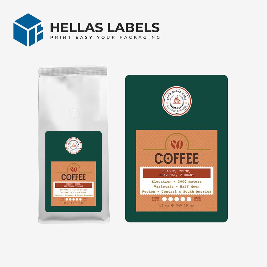 Προσαρμοσμένες ετικέτες καφέ τόσο μοναδικές όσο ο καφές σας! Οι ετικέτες βοηθούν στην προβολή της επωνυμίας σας και στην επικοινωνία με το τι να περιμένετε από τους κόκκους καφέ μέσα στη σακούλα. Μια προσαρμοσμένη τυπωμένη ετικέτα καφέ δελεάζει τους καταναλωτές με την υπόσχεση ενός νόστιμου φλιτζανιού που θα ενθουσιάσει τις αισθήσεις τους. Επωφεληθείτε από τις πρωτότυπες επιλογές μας. Με ελάχιστη ποσότητα παραγγελίας, 50 τεμάχια όλοι μπορούν να απολαμβάνουν τις υψηλότερης ποιότητας ετικέτες συσκευασίας καφέ.