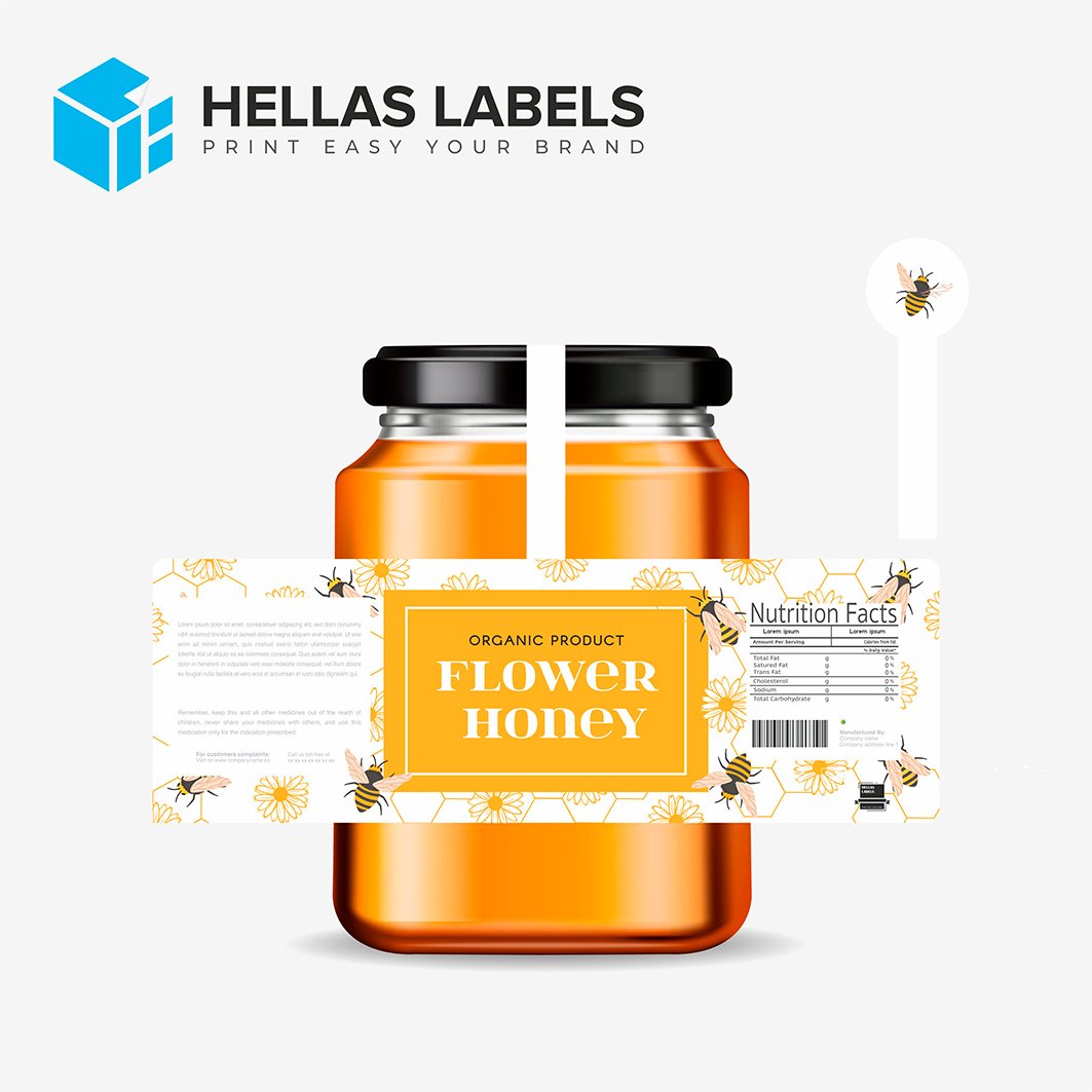 Αυτοκόλλητες προσωποποιημένες ετικέτες για βάζα μελιού, σε επαγγελματικό design με τα στοιχεία σας, το λογότυπό σας ακόμη και χρωματισμούς.
