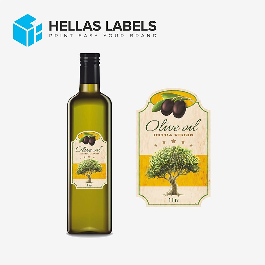 Αυτοκόλλητες προσωποποιημένες ετικέτες για συσκευασία λαδιού 1L ή 750 ml, σε επαγγελματικό design με τα στοιχεία σας, το λογότυπό σας ακόμη και χρωματισμούς.