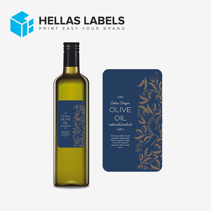 Αυτοκόλλητες προσωποποιημένες ετικέτες για συσκευασία λαδιού 1L ή 750 ml, σε επαγγελματικό design με τα στοιχεία σας, το λογότυπό σας ακόμη και χρωματισμούς.