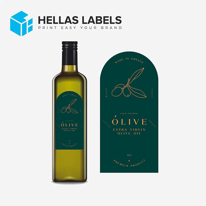 Αυτοκόλλητες προσωποποιημένες ετικέτες για συσκευασία λαδιού 1L ή 750 ml, σε επαγγελματικό design με τα στοιχεία σας, το λογότυπό σας ακόμη και χρωματισμούς.
