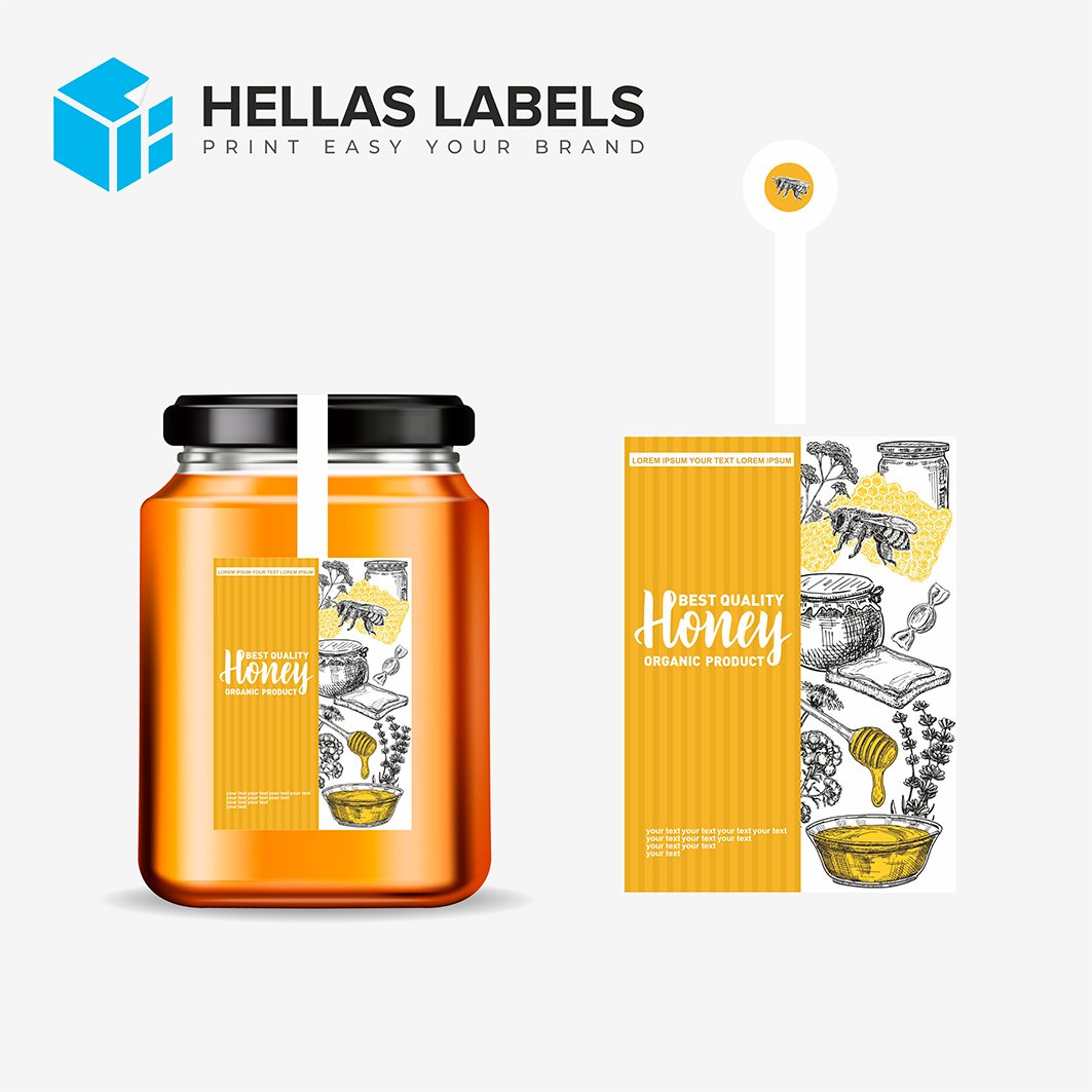 Αυτοκόλλητες προσωποποιημένες ετικέτες για βάζα μελιού, σε επαγγελματικό design με τα στοιχεία σας, το λογότυπό σας ακόμη και χρωματισμούς.