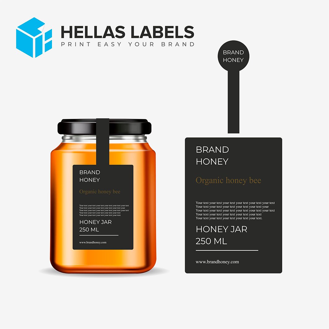 Αυτοκόλλητες προσωποποιημένες ετικέτες για βάζα μελιού, σε επαγγελματικό design με τα στοιχεία σας, το λογότυπό σας ακόμη και χρωματισμούς.